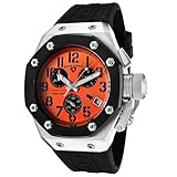 - Orange dial with silver-tone hands; Black arabic numerals; Luminous; Red subdial hands; Black ion-plated stainless steel bezel; Screw-down protective cap on crown